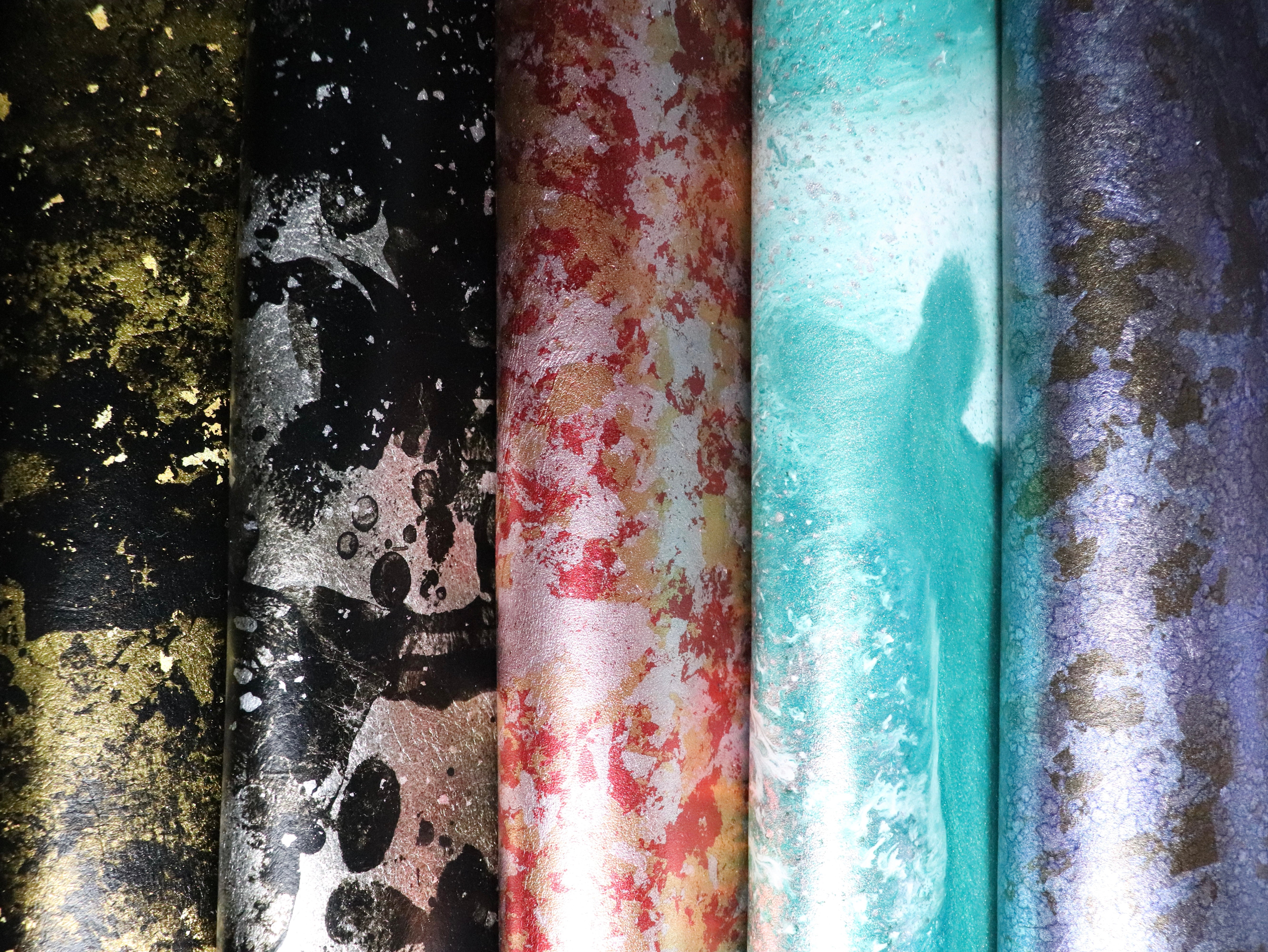 水面に染料を垂らして偶然できる美しいマーブル模様を、そのままピタッと写し取る技法。